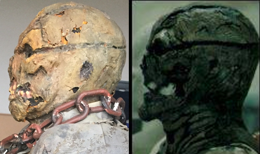 Also evident is the more accurate shape-- the overall shape, machete wound and basic features of the cranium look a lot more like the movie head. There is a lack of crispness in details, and some minor features such as the propeller slashes that seem to be missing or buried. However, as I explain below, this in very likely the movie cranium, and the lack of detail is due to the thick layer of epoxy covering the whole head. This detail masking is also evident in the face (which is definitely movie mold).